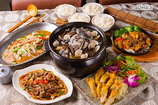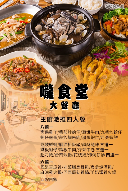 宮保雞丁/番茄炒蚋仔/蔥爆牛肉/九香炒蛤仔/ 蚵仔煎蛋/蒜炒鹹朱肉/滑蛋蝦仁/月亮蝦餅 八選一 + 豆鼓鮮蚵/麻油松阪豬/鹹酥龍珠 三選一 + 鐵板蚵仔/鐵板牛肉/芥茉中卷 三選一 + 起司捲/台南蝦捲/花枝捲/炸蚵仔酥 四選一 + 鳳梨苦瓜雞/老菜脯烏骨雞/烏骨燒酒雞/麻油雞火鍋/巴西蘑菇雞鍋/羊奶頭雞火鍋 六選一 + 四碗白飯