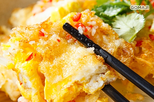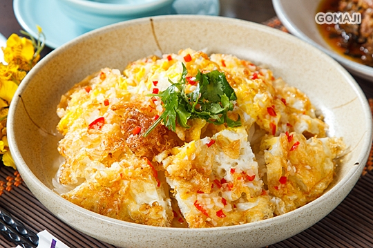 外皮酥脆內裡軟嫩的黃金蛋,佐以酸甜可口又微辣開胃的泰式醬料,完成一道大人小孩都愛的人氣扒飯料理。