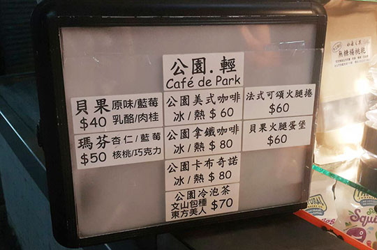 近捷運東門站、東門外市場59攤的公園‧輕 Café de Park,販售多種美味的麵包與小零食,小巧可愛的桌面,放滿了各種吸引人的貝果,簡單的包裝下包裹著迷人的香氣,配上一杯熱美式,小小幸福的下午茶就在公園旁展開。