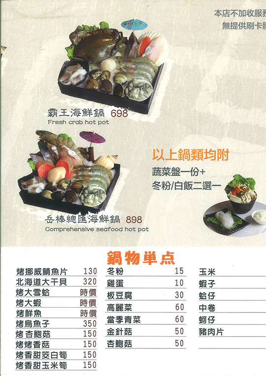 ☞ 只要 229 元,【岳棒海鮮火鍋】平假日皆可抵用 350 元 消費金額 ☜ ✔ 鹽烤秋姑 ✔ 清蒸沙公 ✔ 清蒸處女蟳 ✔ 烤軟絲 ✔ 鹽烤草蝦 ✔ 烤松板豬 ✔ 無骨牛小排 ✔ 大沙公火鍋 ☞ MENU 搶先看!點圖放大 ☜