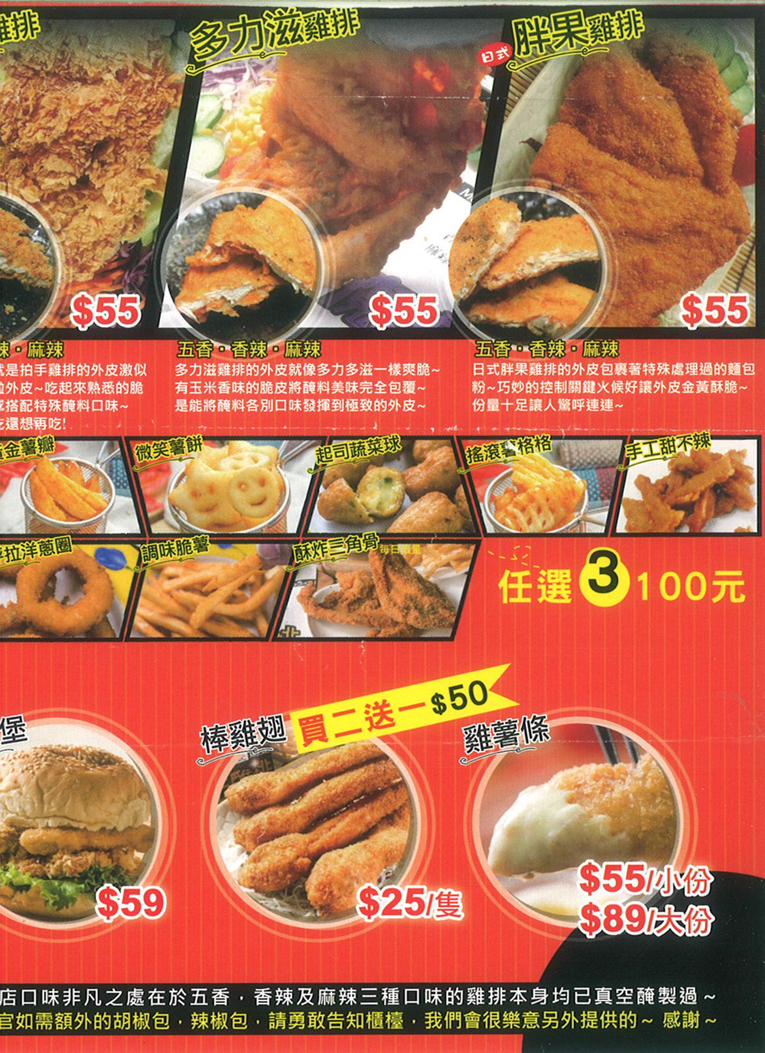 酥脆外皮超美味!一點也不會輸給連鎖速食店的炸雞喔!脆嫩多層次的口感,搭配特殊醃料口味,讓您吃了就不想停下來!