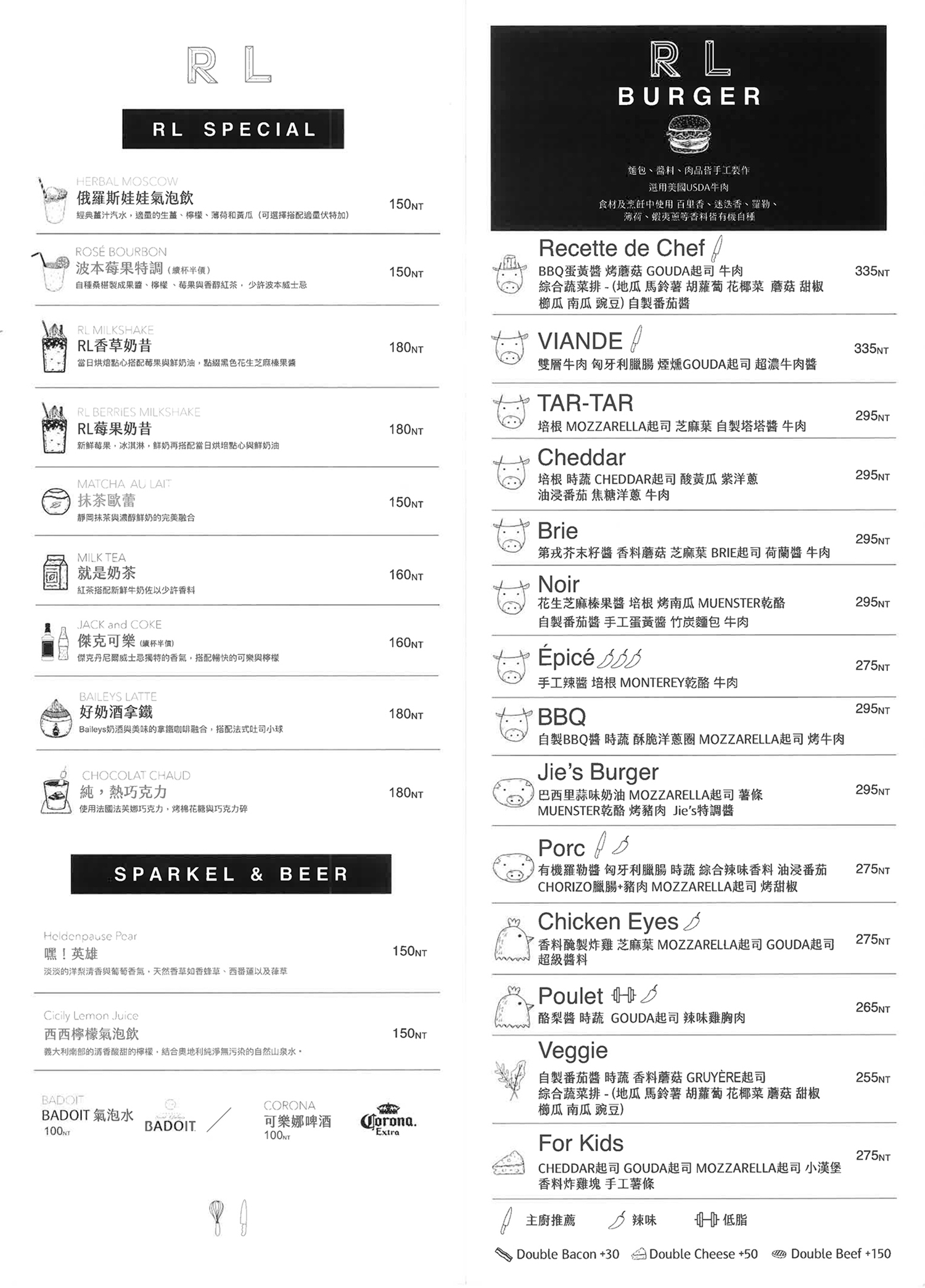 RL 為 Chef Rui & Chef Lo 的縮寫。RL 兩位主廚在巴黎藍帶修業後,前往上海分別在擁有米其林二星的 Chef Le bac 及 2012 亞洲最佳 50 餐廳 Franc bistro 工作,最後輾轉回台,兩人決意合作,攜手創立了「RL 餐廳」。精緻手作的餐點,無論是鹹食或甜點表現可圈可點,將濃厚的異國浪漫結合創意與在地,激盪出舌尖上的火花。