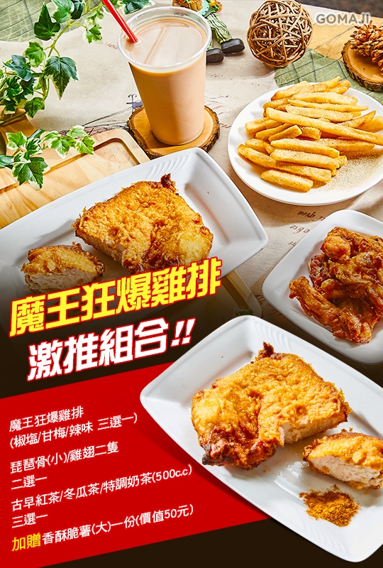 只要120元,即可享有【魔王狂爆雞排】魔王激推組合〈魔王狂爆雞排(椒塩/甘梅/辣味 三選一) + 琵琶骨(小)/雞翅二隻 二選一 + 古早紅茶/冬瓜茶/特調奶茶(500c.c) 三選一〉加贈香酥脆薯(大)一份(價值50元)
