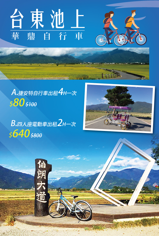 臺東,靠山面海,孕育了豐富的自然生態,純淨、天然是臺東最純樸的驕傲。其中長約21公里的山海鐵馬道,更是單車族的最愛,串起了許多知名景點,沿途經過山景、海濱、森林、河流等景觀,騎上單車就能將台東美景盡收眼底!台東是值得您放慢腳步、細細體會的美好城市!【台東池上 華鼎自行車】提供不同車型,平時細心保養,讓您能夠安全放心的騎著自行車,好好欣賞周邊美麗景緻,徜徉於此,所有的煩惱彷彿都一掃而空了!