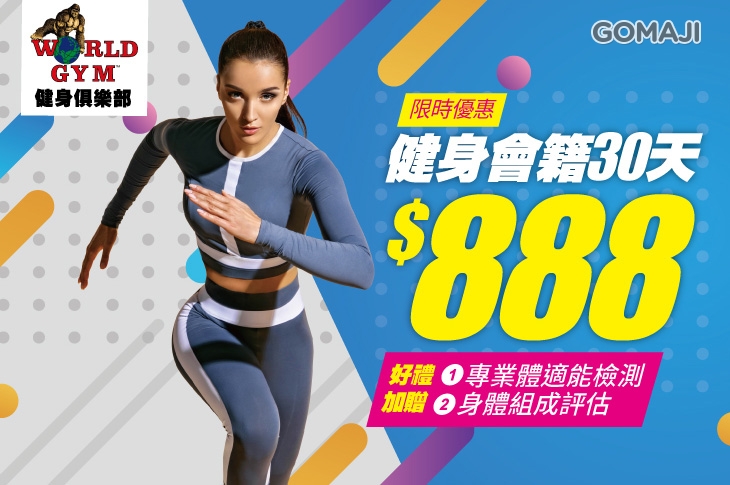 - 本優惠限使用一次(WORLD GYM 世界健身俱樂部所有分店合併計算)
