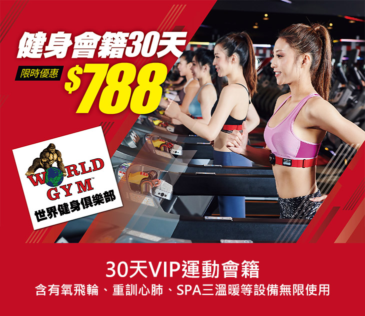 - 本優惠限使用一次(WORLD GYM 世界健身俱樂部所有分店合併計算)