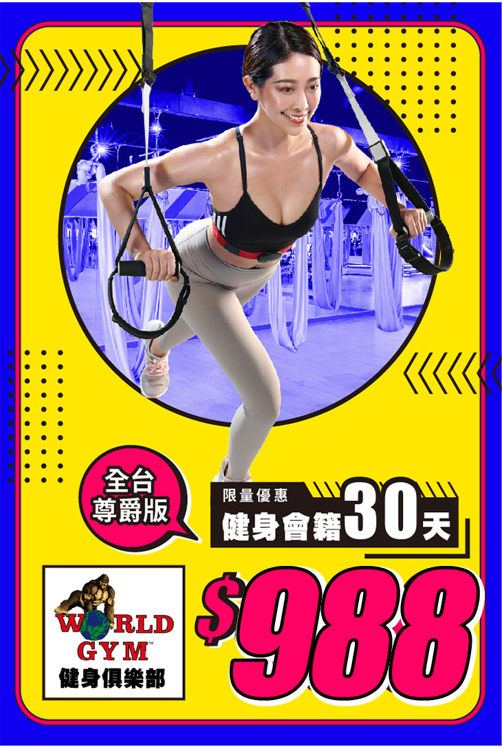 - 本優惠限使用一次(WORLD GYM 世界健身俱樂部所有分店合併計算)