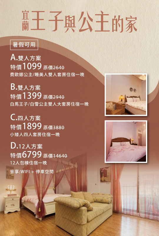 溫馨雅緻住宿氛圍,一進屋內即可卸下所有疲憊,給您最舒適的住宿空間,熱情貼心的服務態度,期盼能帶給您皇室般尊榮待遇,體驗童話故事裡王子與公主的甜蜜生活。