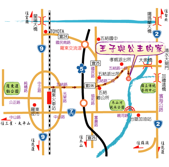 ➴台北 → 蘭陽大橋 (台九省道) → 左轉光榮路 → 見加油站左轉中福路(196線) → 祥盈輕鋼架 → 直行約200公尺至五結路二段107號 (米白色房子) → 見長盛不銹鋼紅色招牌馬上 → 右轉直行到底 → 王子與公主的家。
