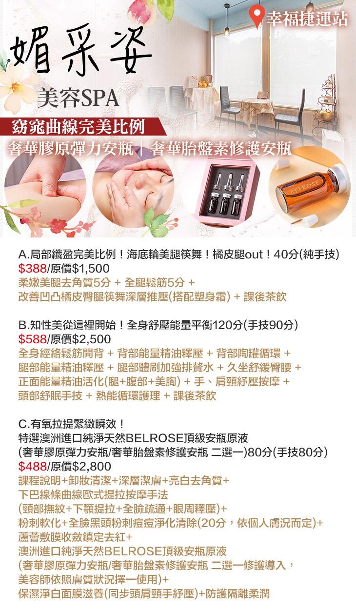 A.局部纖盈完美比例!海底輪美腿筷舞!橘皮腿out!40分(純手技) / B.知性美從這裡開始!全身舒壓能量平衡120分(手技90分) / C.有氧拉提緊緻瞬效!特選澳洲進口純淨天然BELROSE頂級安瓶原液(奢華膠原彈力安瓶/奢華胎盤素修護安瓶 二選一)80分(手技80分)