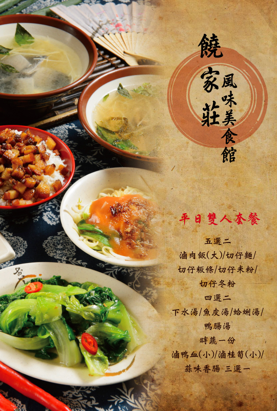 滷肉飯(大)/切仔麵/切仔粄條/切仔米粉/切仔冬粉 五選二 + 下水湯/魚皮湯/蛤蜊湯/鴨腸湯 四選二 + 時蔬一份 + 滷鴨血(小)/滷桂筍(小)/蒜味香腸 三選一