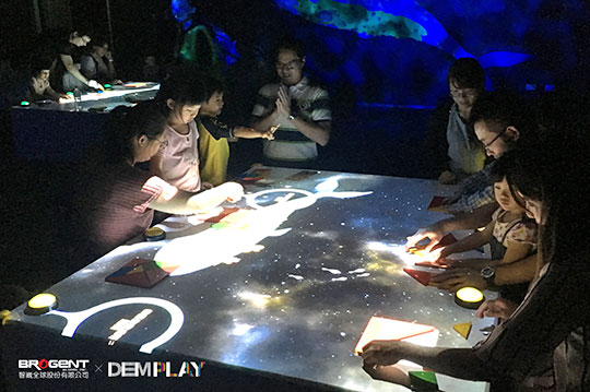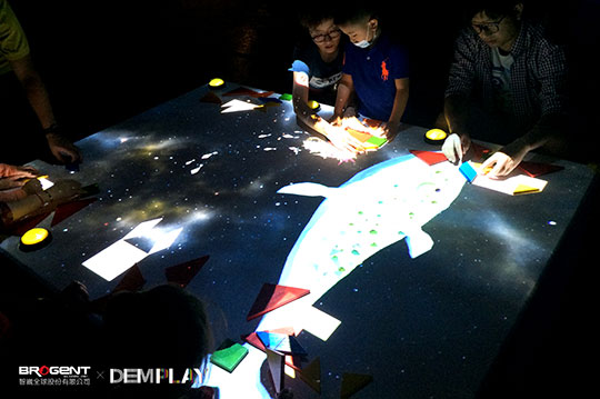 以每組六個人為單位進行體驗,在互動桌上按下按鈕啟動任務,運用彩色七巧板拼湊出不同的動物及動物愛吃的食物喔!