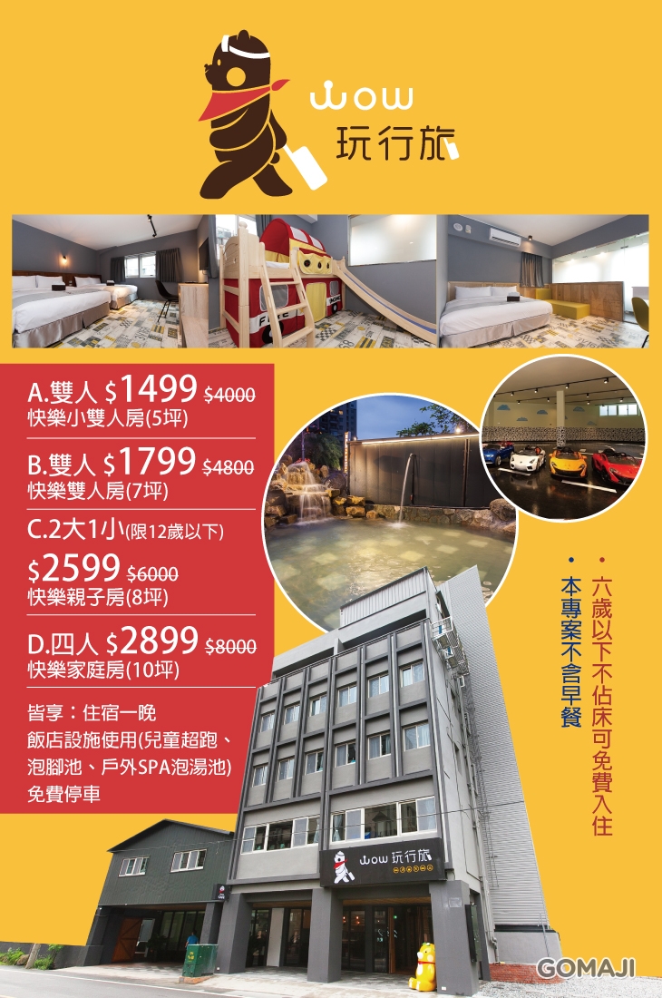 位於聞名的溫泉鄉-礁溪,鄰近五峰旗風景區,是一間結合現代工業風及親子旅館概念的旅館,充滿童趣的可愛店面,有著令人駐足的悠閒氛圍,讓旅客來到此都能擁有愉快放鬆的好心情,希望帶給您充滿活力且親切的服務,都能夠感受到『wow』的魅力!