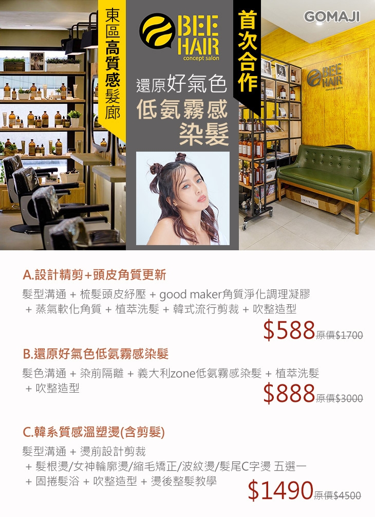 位於微風廣場附近的巷弄裡,BEE HAIR 髮型設計師皆具備豐富的資歷、專業的技術,透過體貼的服務、頂級的髮品,用心呵護您的秀髮,創造出時尚潮流的質感造型。店內空間寬敞舒適,輕工業風的裝潢融入暖黃的色調,給人放鬆又充滿活力的感覺,讓您每次的到來都能擁有最享受的美髮體驗!