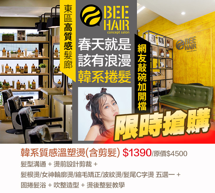 位於微風廣場附近的巷弄裡,BEE HAIR 髮型設計師皆具備豐富的資歷、專業的技術,透過體貼的服務、頂級的髮品,用心呵護您的秀髮,創造出時尚潮流的質感造型。店內空間寬敞舒適,輕工業風的裝潢融入暖黃的色調,給人放鬆又充滿活力的感覺,讓您每次的到來都能擁有最享受的美髮體驗!