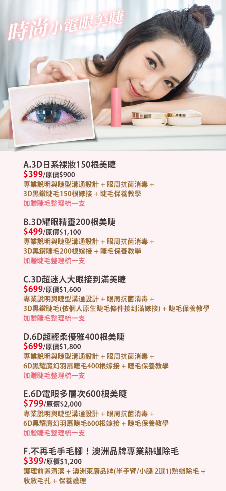 A.3D日系裸妝150根美睫 / B.3D耀眼精靈200根美睫 / C.3D超迷人大眼接到滿美睫 / D.6D超輕柔優雅400根美睫 / E.6D電眼多層次600根美睫 / F.不再毛手毛腳!澳洲品牌專業熱蠟除毛