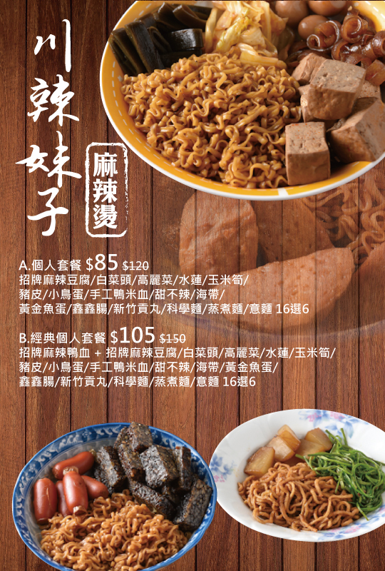 A.個人套餐〈招牌麻辣豆腐/白菜頭/高麗菜/水蓮/玉米筍/豬皮/小鳥蛋/手工鴨米血/甜不辣/海帶/黃金魚蛋/鑫鑫腸/新竹貢丸/科學麵/蒸煮麵/意麵 16選6〉