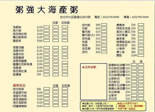 位於台北市大安區通化街34號,近捷運信義安和站!食材皆嚴格挑選、用心製作,老闆親切熱情的招呼,給您最溫暖的感受!看似簡單的料理方式,靠著嫻熟手藝,讓一碗碗現點現做的好吃粥品華麗變身,在這個寒冷的冬天給您熱騰騰的美味!