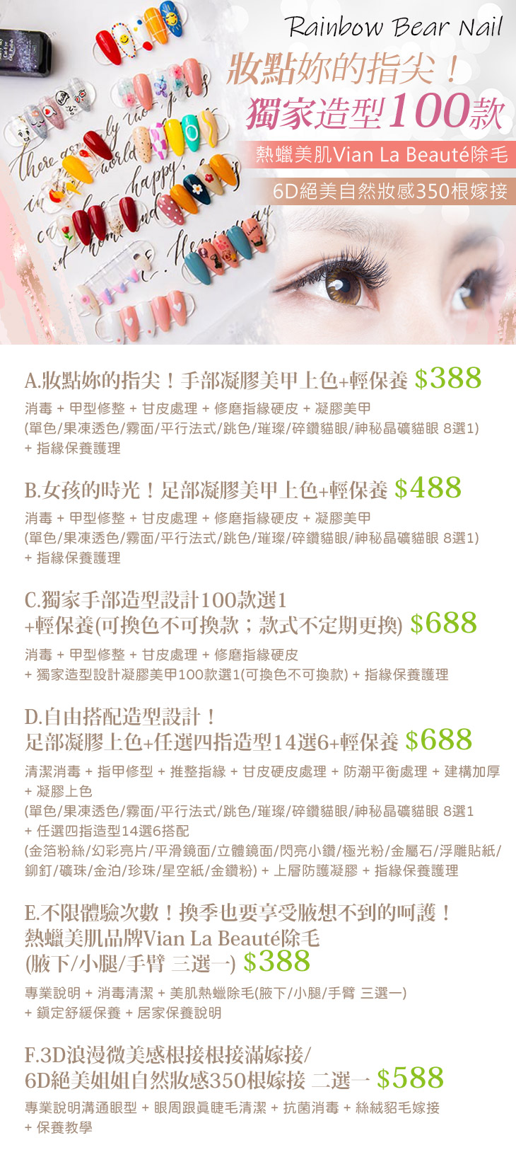 A.妝點妳的指尖!手部凝膠美甲上色+輕保養 / B.女孩的時光!足部凝膠美甲上色+輕保養 / C.獨家手部造型設計100款選1+輕保養(可換色不可換款;款式不定期更換) / D.自由搭配造型設計!足部凝膠上色+任選四指造型14選6+輕保養 / E.不限體驗次數!換季也要享受腋想不到的呵護!熱蠟美肌品牌Vian La Beauté除毛(腋下/小腿/手臂 三選一) / E.不限體驗次數!換季也要享受腋想不到的呵護!熱蠟美肌品牌Vian