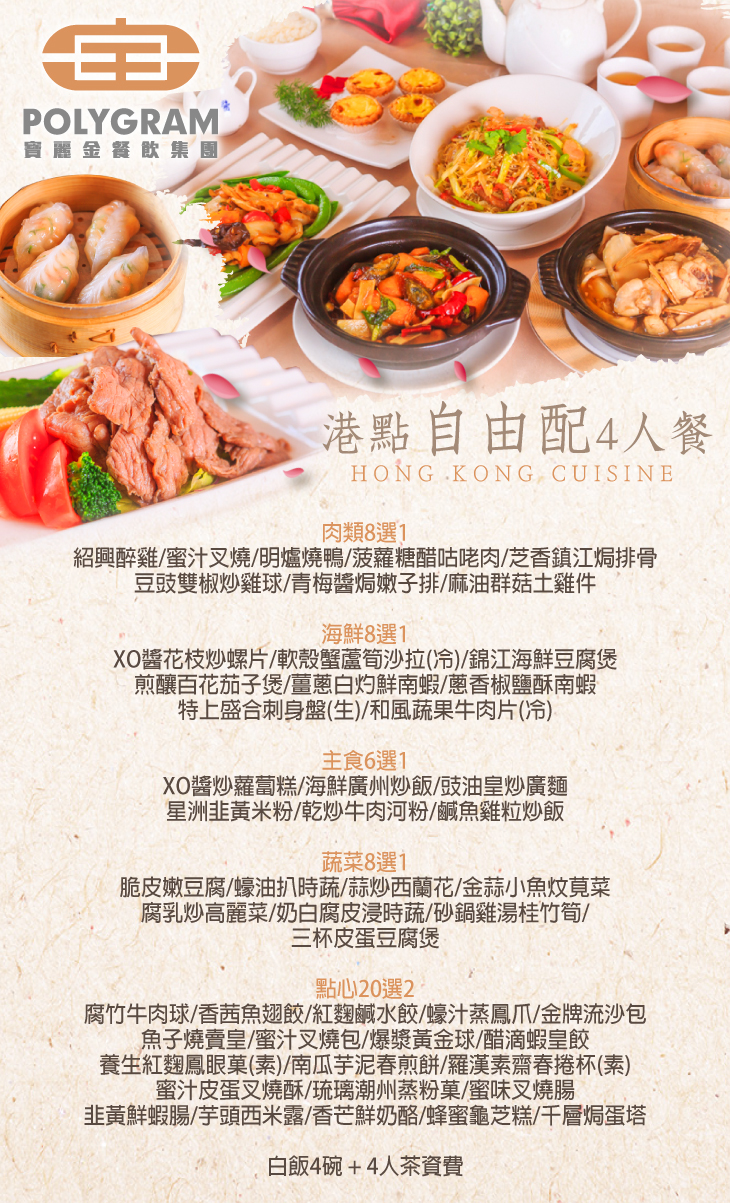〈肉類8選1 + 海鮮8選1 + 主食6選1 + 蔬菜8選1 + 點心20選2 + 白飯4碗 + 4人茶資費〉
