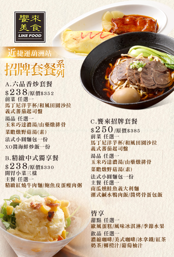 前菜:馬丁尼洋芋杯/和風田園沙拉/義式蕃茄起司盤 任選一 + 湯品:玉米巧達濃湯/山藥燉排骨/菜瞻燉野菇湯(素) 任選一 + 法式小圓麵包一份 + 主餐:南瓜燻鮭魚義大利麵/潮式鹹水鴨肉飯/醬烤骨蛋包飯 任選一 + 甜點:歐風蛋糕/風味冰淇淋/季節水果 任選一 + 飲品:濃縮咖啡/美式咖啡/冰拿鐵/紅茶/奶茶/柳橙汁/葡萄柚汁 任選一
