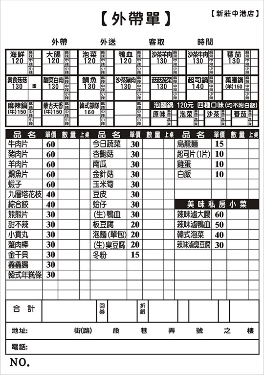 特別推薦:麻辣鍋、蒙古天香鍋、韓式部隊鍋、鴨血鍋、起司鍋、辣味滷鴨血、辣味滷臭豆腐