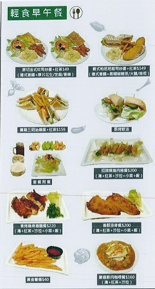 特別推薦:牛肉起司麥香堡、招牌總匯義式帕尼尼、豬肉蛋燒餅、招牌總匯吐司、起司火腿蛋弗卡夏、牛肉蛋滿福堡、黑芝麻磚厚片、嚴選豬肉咖哩、香烤無骨雞腿餐盒、招牌燒烤肉捲餐盒、香酥排骨餐盒、(薰雞三明治總匯+紅茶)、(厚切法式吐司炒蛋+紅茶)、香烤無骨雞腿餐、香酥排骨餐、美式黑咖啡、拿鐵咖啡、特選紅茶