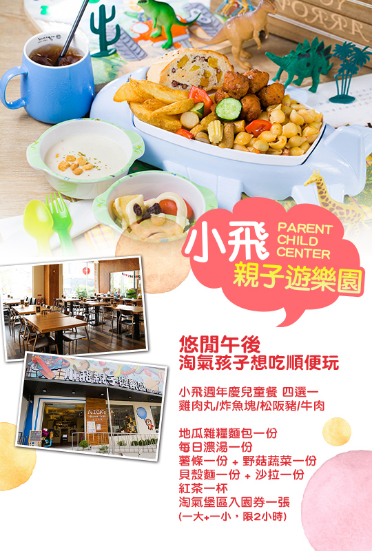 只要209元,即可享有【小飛親子遊樂園】悠閒午後,淘氣孩子想吃順便玩!〈含小飛週年慶兒童餐:雞肉丸/炸魚塊/松阪豬/牛肉 四選一 + 地瓜雜糧麵包一份 + 每日濃湯一份 + 薯條一份 + 野菇蔬菜一份 + 貝殼麵一份 + 沙拉一份 + 紅茶一杯 + 淘氣堡區入園券一張(含一大+一小,限2小時)〉
