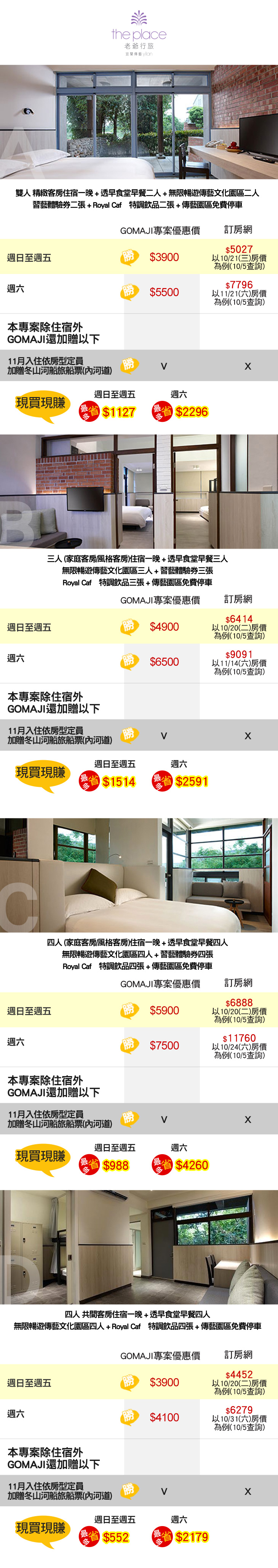 ★ 提供雙人/三人/四人舒適客房,也有CP值較高的四人上下舖客房可供選擇。翌日早起享用豐盛的早餐,貼心加贈Royal Café特調飲品及習藝體驗券(ABC方案),歡迎大小朋友一起體驗傳統文化的薰陶!