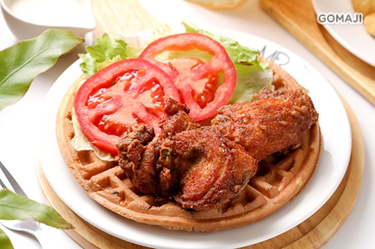 ✔ 特製炸雞鬆餅(原味炸雞+厚鬆餅+番茄生菜)