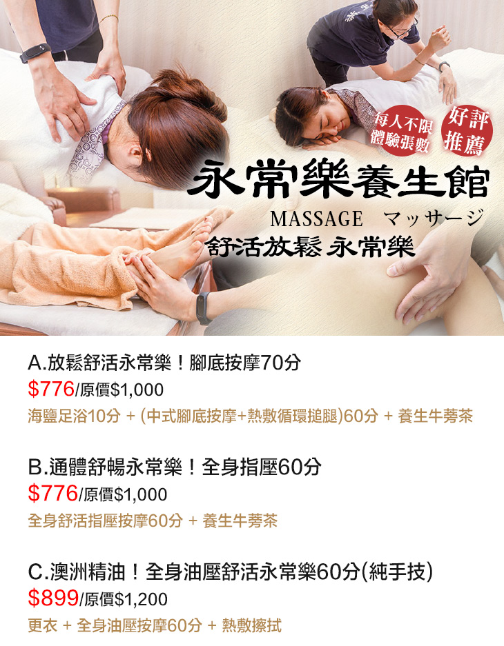 C.澳洲精油!全身油壓舒活永常樂60分(純手技)