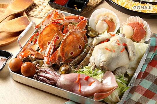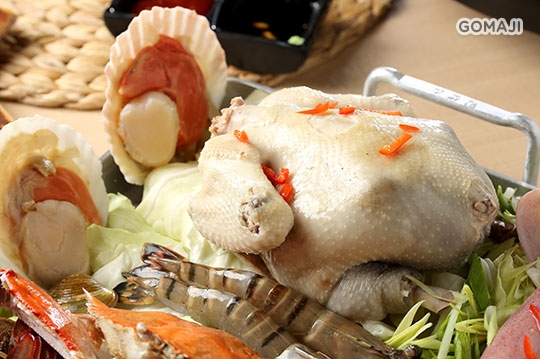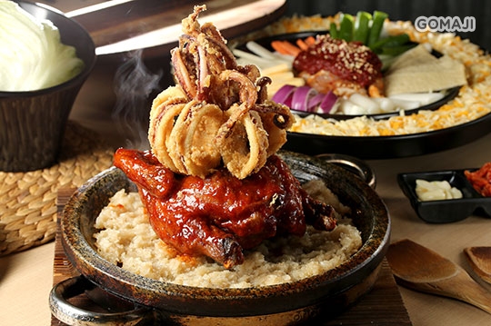 將玉米春雞以 250 度高溫烘烤後所滴下的天然雞油,混入糯米飯後攪拌成雞油糯米飯,再平均鋪於高溫300度的石鍋上面,當米飯觸碰到高溫的石鍋表面上會產生嗶啵的油爆聲,成就出雞油鍋巴飯!最後將新鮮脆皮的春雞鋪在鍋巴飯上面,加上新鮮的深海大魷魚,讓人光看就覺得好滿足!
