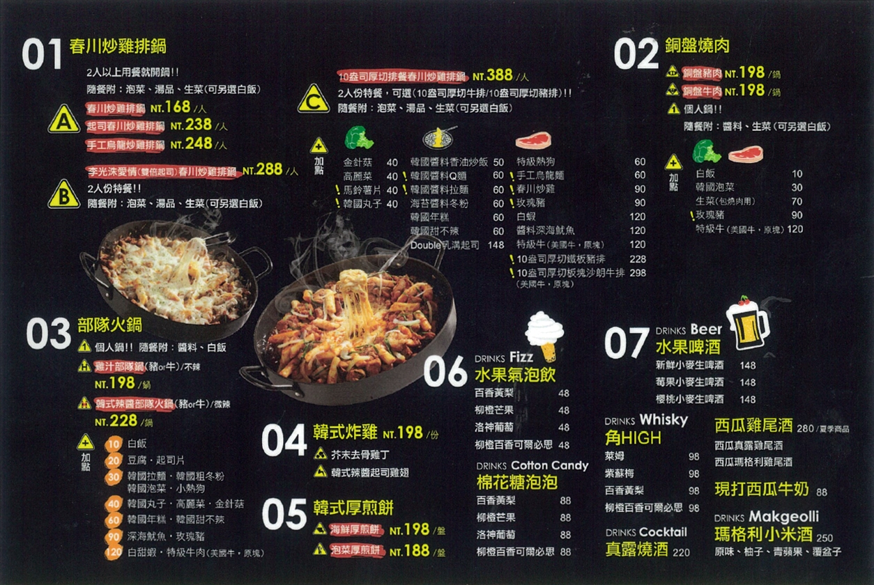 一鍋二吃!使用韓國傳統的鑄鐵黑鍋,新鮮的韓國烤肉,吃得到燒肉的鮮甜與外皮焦脆口感!內鍋就是豐富誘人的部隊鍋,湯濃、麵Q!當熱騰騰的濃湯融化了在Q麵上面的起司片後,一口吸允飽滿湯汁的麵條,滿口都是濃郁的起司味道與濃湯的香氣,超幸福!