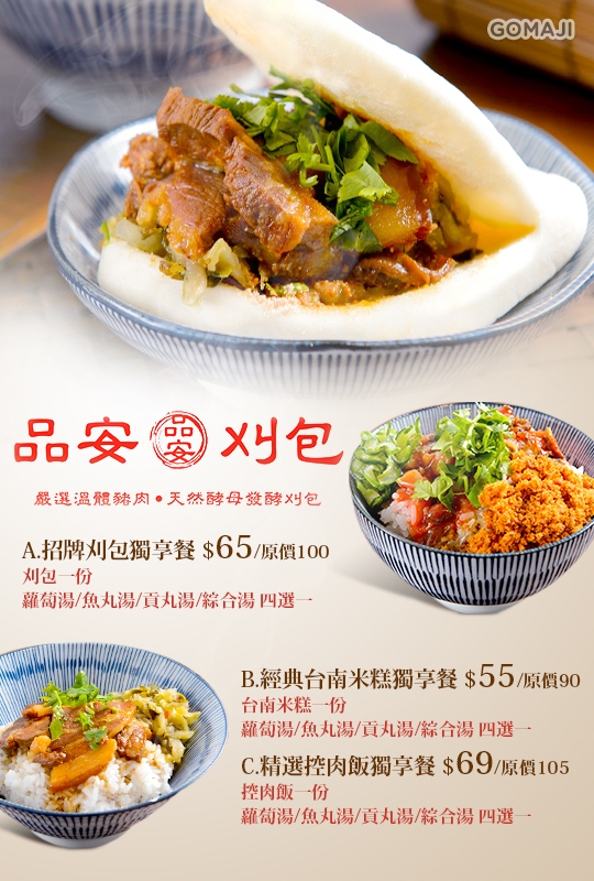 A.招牌刈包獨享餐〈刈包一份 + 蘿蔔湯/魚丸湯/貢丸湯/綜合湯 四選一〉 / B.經典台南米糕獨享餐〈台南米糕一份 + 蘿蔔湯/魚丸湯/貢丸湯/綜合湯 四選一〉 / C.精選控肉飯獨享餐