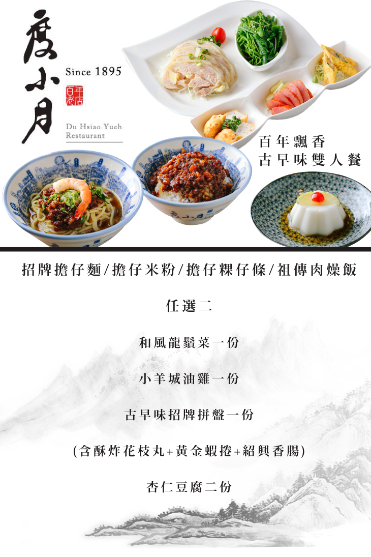 榮獲 2013 年亞洲最佳 101 餐廳,日本、韓國、香港、新加坡等觀光客來台必嚐的美味之一!【度小月(永康店)】至今已一百二十年的歷史,將擔仔麵傳統古法流傳至今,在美食料理上以新台灣料理自居,深度挖掘各地方特有食材,融合入時令、入菜,並呈現一道道與眾不同的菜色佳餚,讓色、香、味一應俱全的呈現。