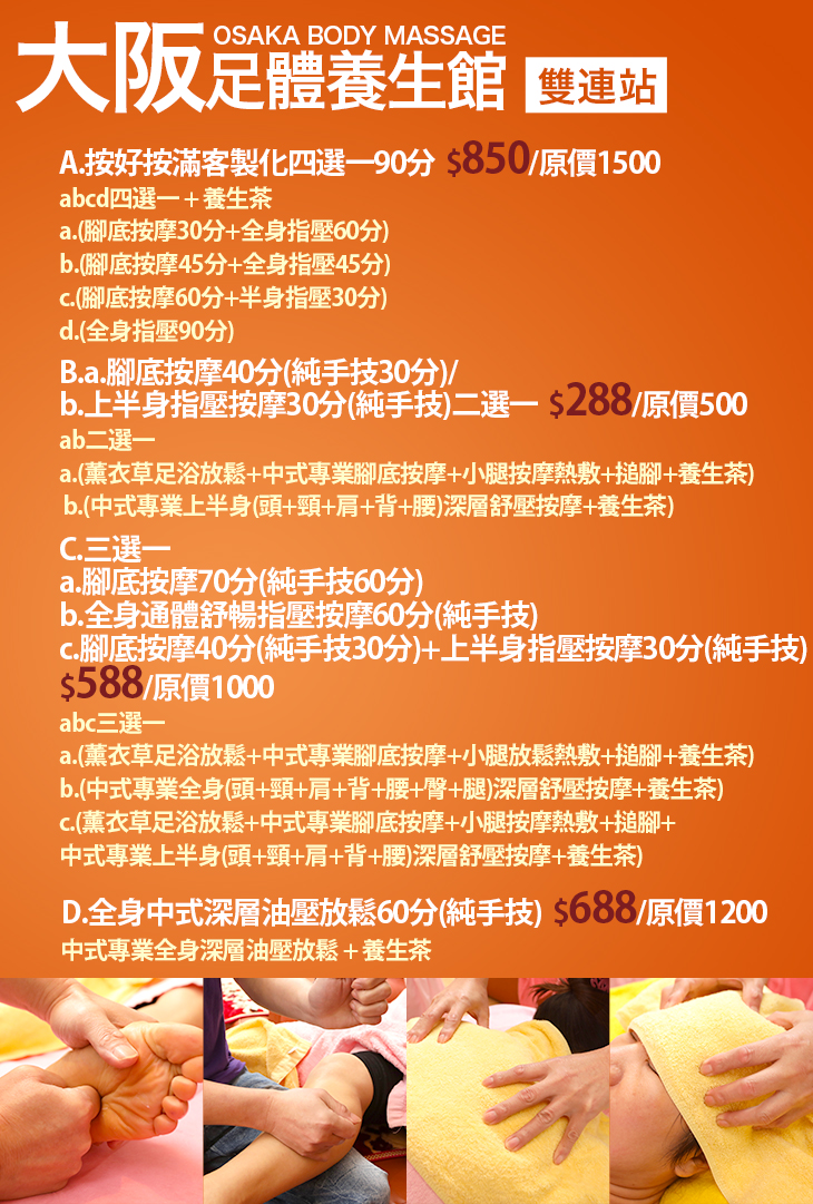 A.按好按滿客製化四選一90分 / B.(a.腳底按摩40分(純手技30分)/b.上半身指壓按摩30分(純手技)二選一) / C.a.腳底按摩70分(純手技60分)/b.全身通體舒暢指壓按摩60分(純手技)/c.腳底按摩40分(純手技30分)+上半身指壓按摩30分(純手技) 三選一 / D.全身中式深層油壓放鬆60分(純手技)