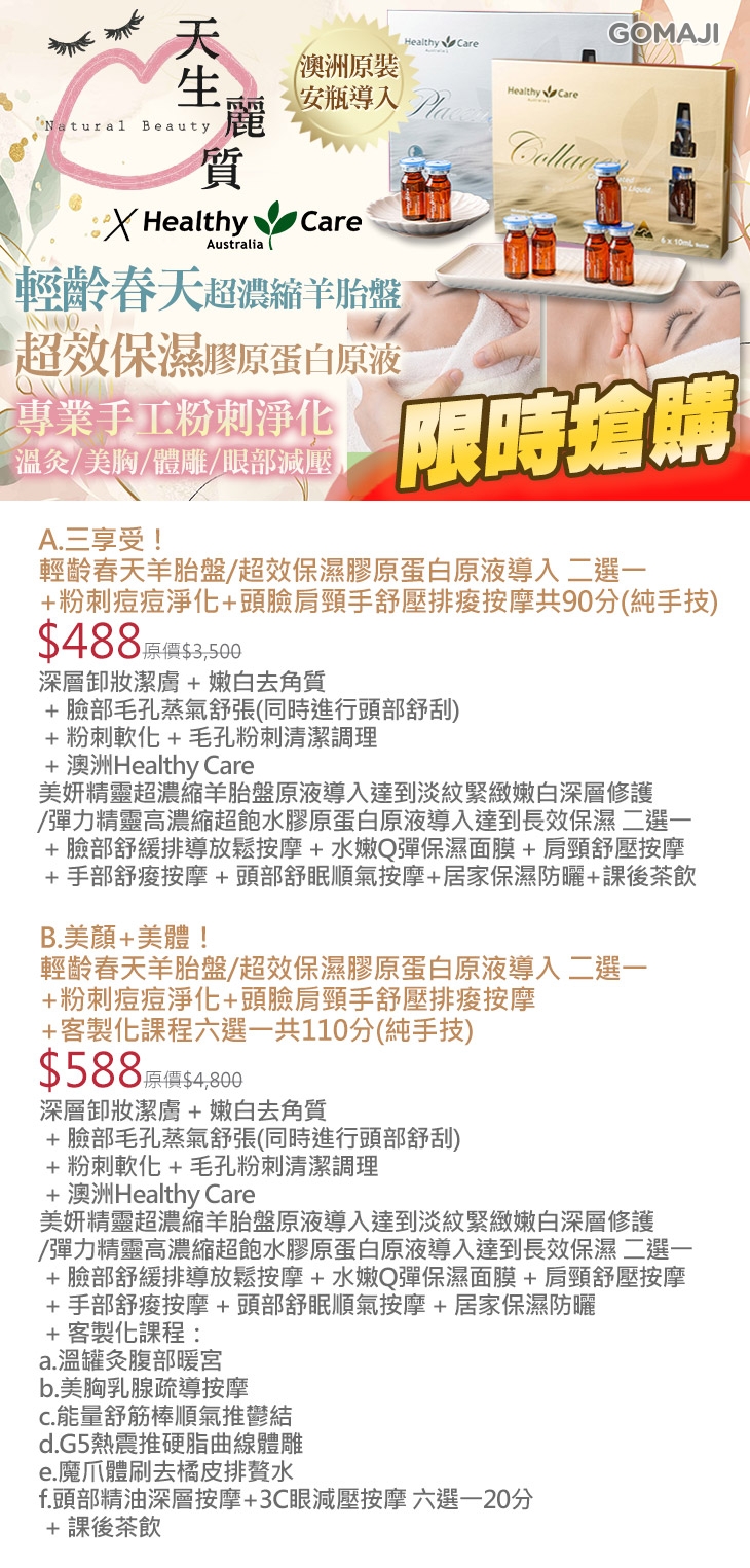 〈深層卸妝潔膚 + 嫩白去角質 + 臉部毛孔蒸氣舒張(同時進行頭部舒刮) + 粉刺軟化 + 毛孔粉刺清潔調理 + 澳洲Healthy Care美妍精靈超濃縮羊胎盤原液導入達到淡紋緊緻嫩白深層修護/彈力精靈高濃縮超飽水膠原蛋白原液導入達到長效保濕 二選一 + 臉部舒緩排導放鬆按摩 + 水嫩Q彈保濕面膜 + 肩頸舒壓按摩 + 手部舒痠按摩 + 頭部舒眠順氣按摩+居家保濕防曬+課後茶飲〉