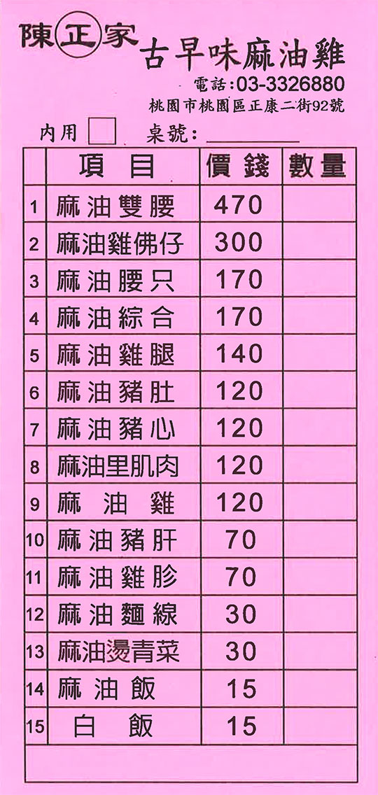 特別推薦:麻油雙腰、麻油雞、麻油綜合、麻油麵線、麻油燙青菜
