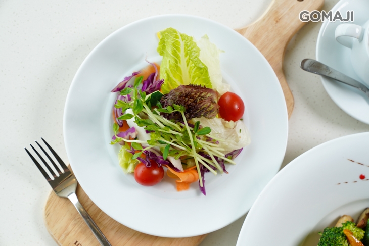嫩煎填餡米糕雞肉捲佐巴沙米可醋醬汁 + 歐美自助式沙拉吧吃到飽▼