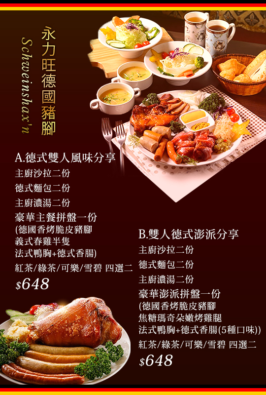 近永和頂溪捷運站(不遠處即是赫赫有名的永和世界豆漿大王),以德國豬腳聞名的歐式餐廳,想到德國豬腳就想到永力旺。店內的裝潢充滿濃濃的異國風情,連天花板上都掛著德國國旗,溫馨舒適的氛圍十分適合和三五好友在此談天享食。精心嚴製『招牌德國豬腳』精選來自加拿大前二腳腱肉,結合現代科技工藝,以德式手做烹製色、香、味俱全的經典豬腳,溫潤香烤,展現脆皮炙嫩、香滑多汁口感!