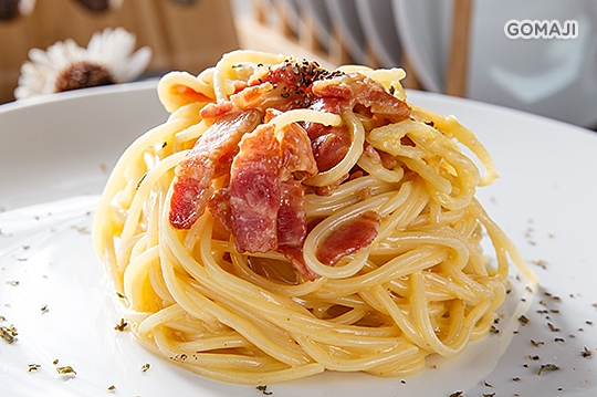 Q 彈的義大利麵裹上滿滿醬汁,濃郁香滑的好滋味瞬間在口中綻開,還搭配鹹香軟嫩的培根,使這道經典美味更加美味誘人!