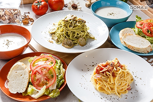 奶油芥末雞胸義大利麵/蛋黃醬培根義大利麵/自製牛肉丸義大利麵/蕃茄雞胸肉義大利麵/奶油培根義大利麵/時令鮮蔬義大利麵/橄欖油蒜辣義大利麵/青醬蘑菇義大利麵 任選二 + 今日例湯二份 + 沙拉二份 + 麵包二份