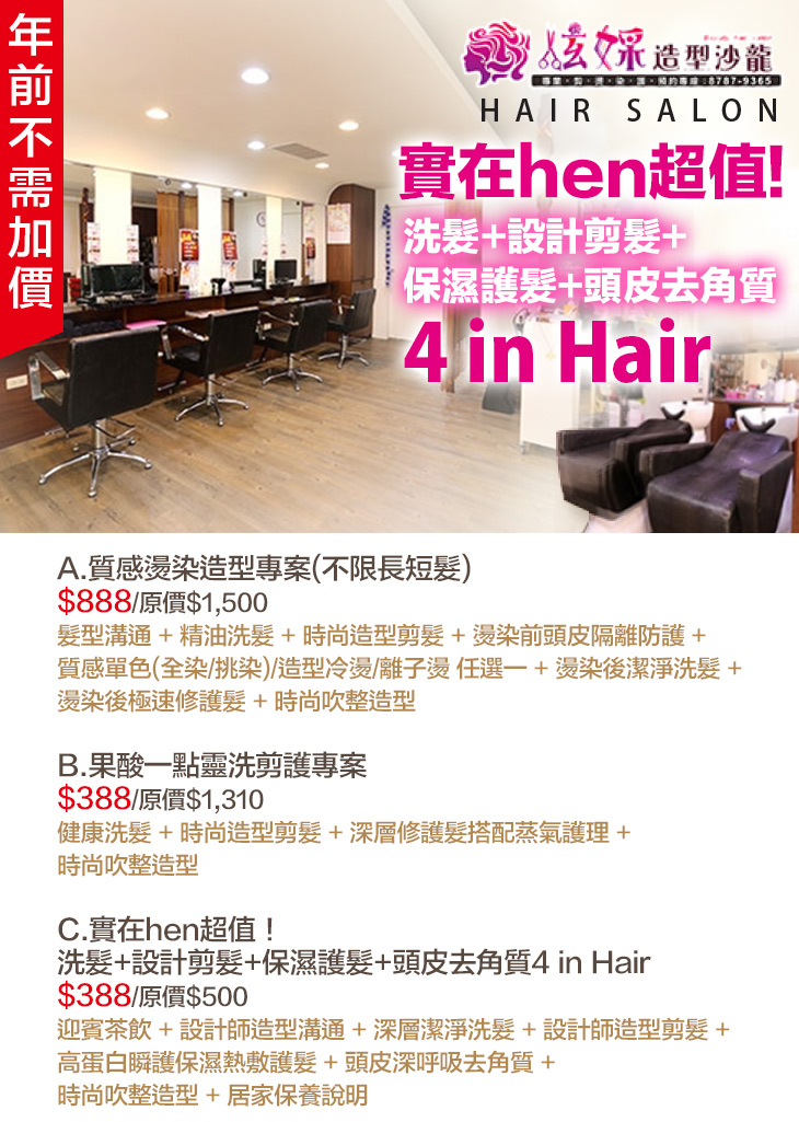 A.質感燙染造型專案(不限長短髮) / B.果酸一點靈洗剪護專案 / C.實在hen超值!洗髮+設計剪髮+保濕護髮+頭皮去角質4 in Hair