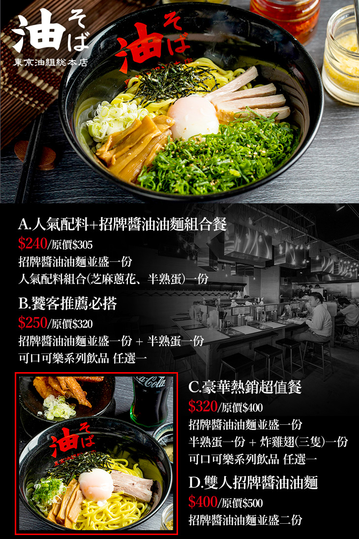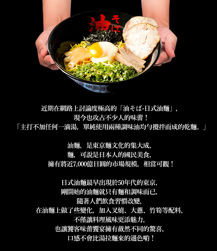 【東京油組総本店】是由台灣頂呱呱集團自日本東京池袋的東京油組總本店引進的美食新生力軍!更是台灣餐飲市場少數專攻油麵的新創品牌!東京油組總本店將日本國民美食,透過〝創新、轉變〞,以嶄新的面貌呈現,可說是成功地為麵市場開拓新的視野!