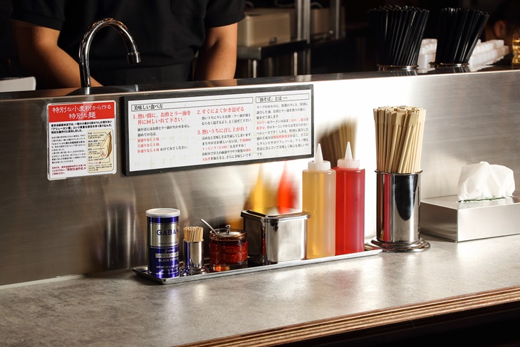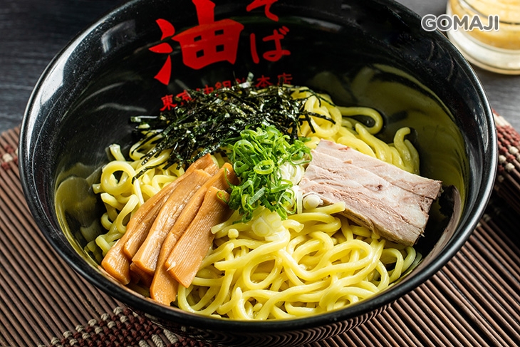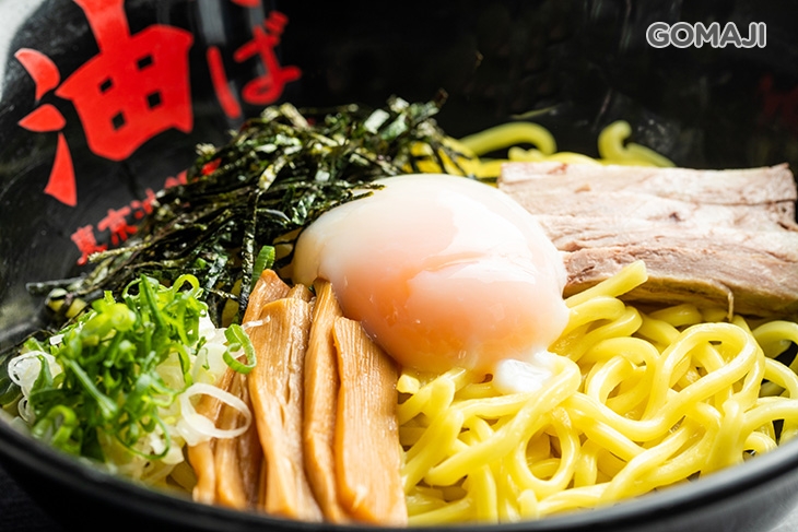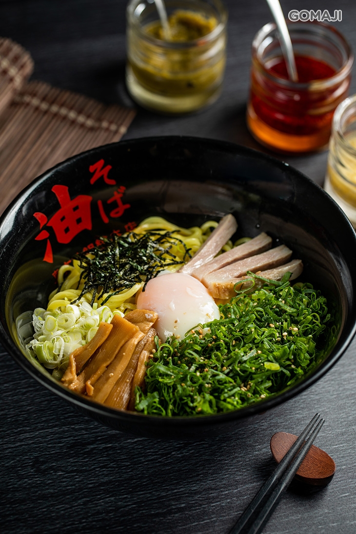 「招牌醬油油麵,請慢用!」端上桌,整齊有序的擺盤,搭配黑底紅字的碗,讓各式食材化身為最受歡迎的耀眼巨星,成功吸引老饕的目光!光擺盤就能感受到【東京油組総本店】對料理的執著與講究!