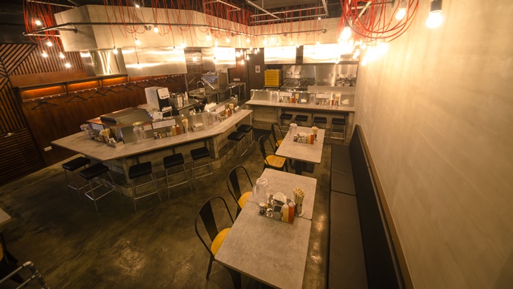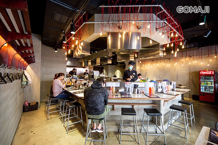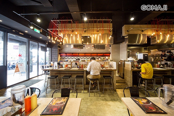 以黑色刷漆磚打造的門面,搭配大大紅色顯著的霓虹燈造型招牌,在人車來往的街道上,成功吸引路人的目光!以約佔三分之二面積的透明玻璃門窗取代枯燥乏味的外牆,讓陽光自然灑進!為室內注入不一樣的生命力,讓餐廳氛圍更有朝氣!輕工業風的裝潢,搭配中島半開放式的料理台,讓整體視覺空間更延伸,用起餐來格外舒適、無壓迫感!