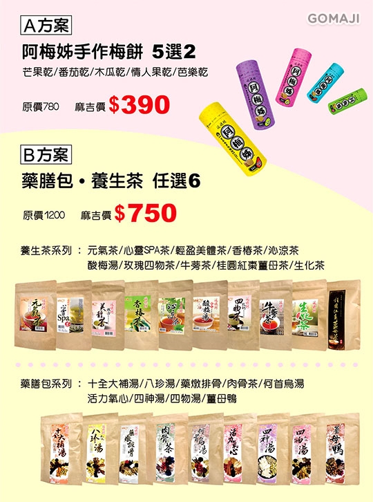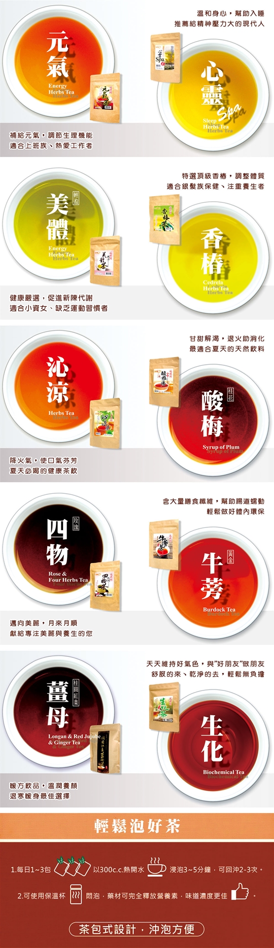 元氣茶/桂圓紅棗薑母茶/玫瑰四物茶/香椿茶/桂花酸梅湯/沁涼茶/輕盈美體茶/心靈Spa茶/生化茶/牛蒡茶