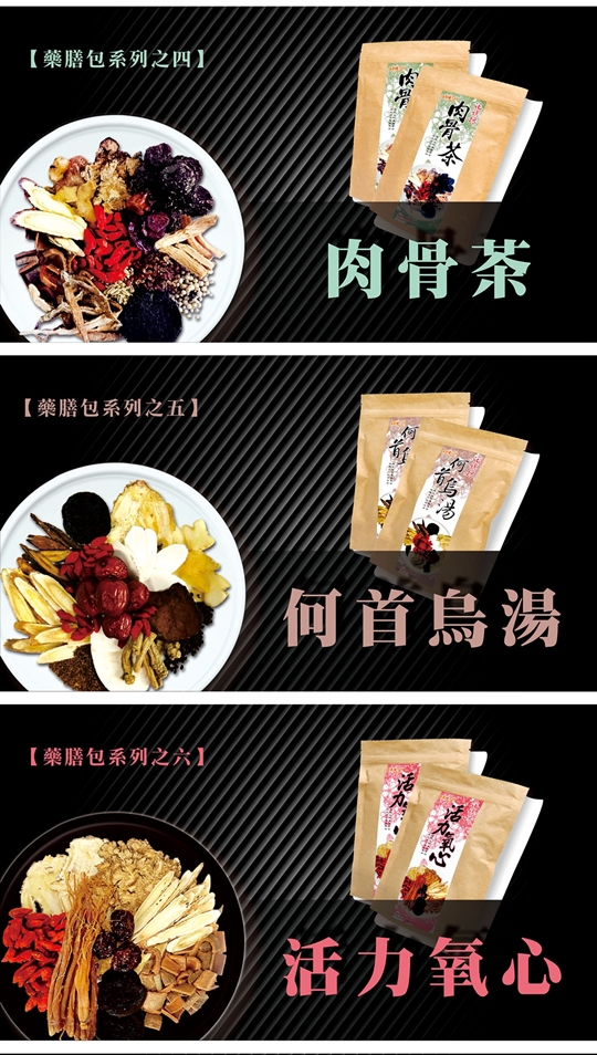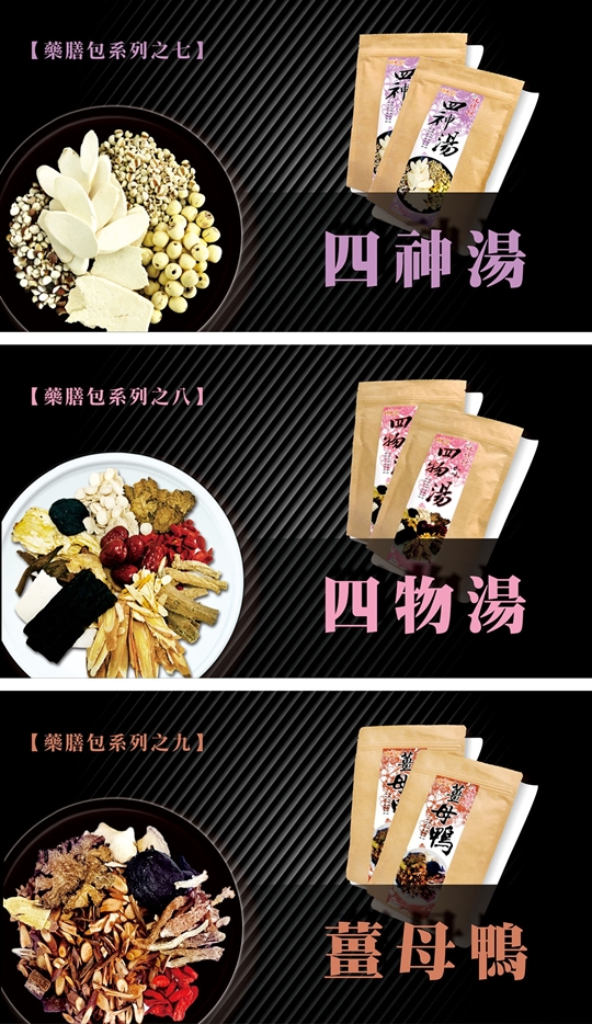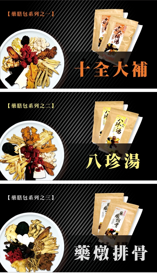十全大補湯/何首烏湯/八珍湯/肉骨茶/四物湯/四神湯/薑母鴨/活力氧心湯/藥燉排骨