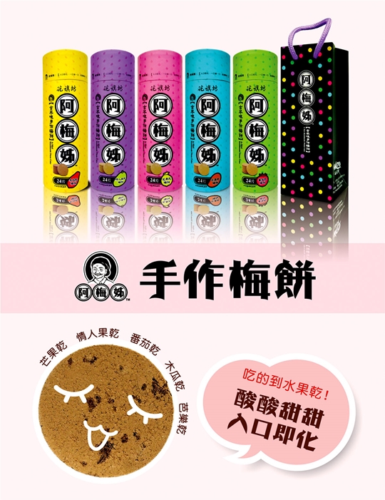 延續傳統、創新出發!堅持用純天然的漢方食材,特別與台灣在地小農合作、加入台灣道地水果乾,增添梅餅風味及咀嚼口感。繽紛可愛的包裝,懷舊也能很時尚!