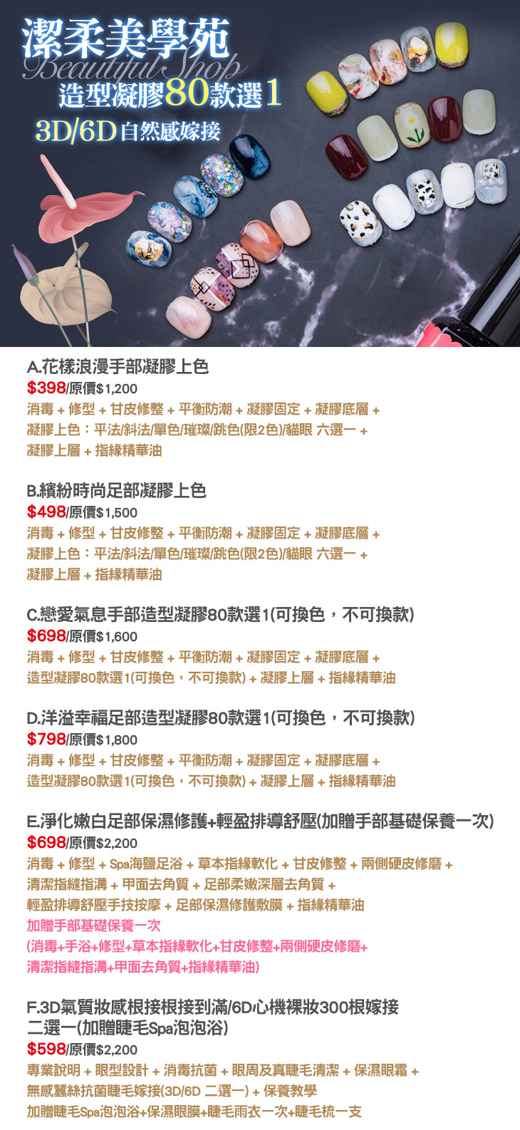 A.花樣浪漫手部凝膠上色 / B.繽紛時尚足部凝膠上色 / C.戀愛氣息手部造型凝膠80款選1(可換色,不可換款) / D.洋溢幸福足部造型凝膠80款選1(可換色,不可換款) / E.淨化嫩白足部保濕修護+輕盈排導舒壓(加贈手部基礎保養一次) / F.3D氣質妝感根接根接到滿/6D心機裸妝300根嫁接 二選一(加贈睫毛Spa泡泡浴)